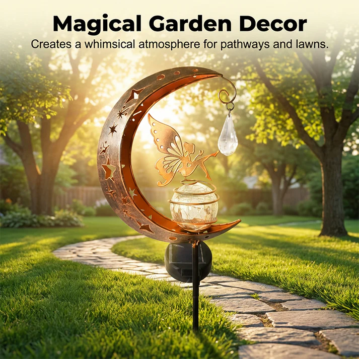 ENCHANTING FAIRY & MOON DESIGN - Add a touch of magic to your garden. This unique light features a delicate fairy perched on a crackled glass globe, framed by a crescent moon, creating a whimsical, storybook ambiance.